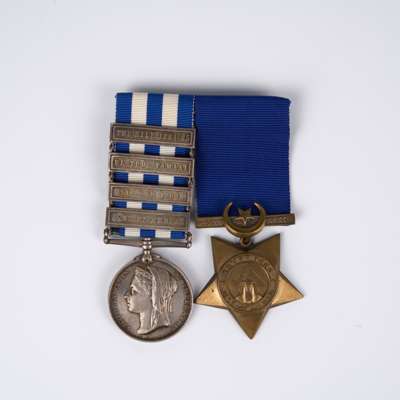 A Very Good Egypt Medal Khedives Star Pair awarded to Private F. Wilson 1st Battalion Gordon Highlanders, comprising Egypt Medal 1882-89, dated reverse, four clasps, Tel-El-Kebir, Suakin 1884, El-Teb-Tamaai, The Nile 1884-85, (2082. Pte. F. Wilson. 1/Gord: Highrs:), Khedives Star 1882, unnamed as issued, rubbing from Star to the word Highrs, contemporarily mounted for wear, usual pitting, lightly toned very fine (2)