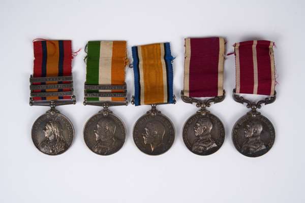 The Group of 5 awarded to Colour Serjeant, later, Acting Regimental Serjeant Major John Arther Wharton, 1st Battalion The Yorkshire Regiment and Frontier Constabulary Volunteer Rifles, who served throughout the Great War in India comprising, Queen’s South Africa Medal, 2nd type, 3 clasps, Cape Colony, Orange Free State, Transvaal, (5628 Col. J. Wharton. Cheshire Regt.), King’s South Africa Medal, 2 Clasps, South Africa 1901, South Africa 1902, (5628 Corpl: J. A. Wharton. Cheshire Regt.), both impressed naming, 1914-1920 British War Medal, (5628 C. Sjt. J. A. Wharton. Ches. R.), Army Long Service and Good Conduct Medal, GVR. (C.S. Instr. J. A. Wharton. F.C. Vol. Rifles.) named in running script to Europeans in the Indian Army, Meritorious Service Medal, GVR, (17202 C. Sjt. J.A. Wharton. 1/York. R.), all toned very fine (5)