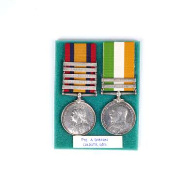 A Coldstream Guards Boer War Pair awarded to Private Arthur Gibson comprising, Queen’s South Africa Medal, 2nd type, ghost dates, 5 clasps, Cape Colony, Driefontein, Johannesburg, Diamond Hill, Belfast, (1679 Pte A. Gibson. Cldstm: Gds.), King’s South Africa Medal, 2 clasps, South Africa 1901, South Africa 1902, (1679 Pte A. Gibson. Coldstream Guards.), both impressed naming, lightly toned very fine (2)