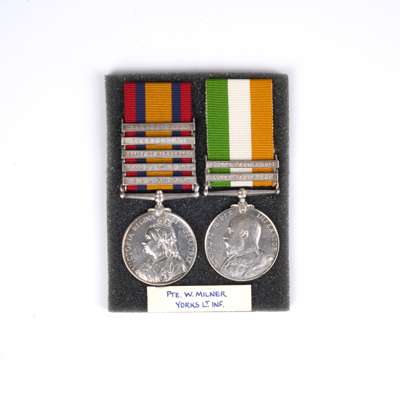 A Boer War Pair awarded to Private William Milner, 2nd Battalion Yorkshire Light Infantry comprising Queen’s South Africa Medal, 2nd type, ghost dates, 5 clasps, Belmont, Modder River, Relief of Kimberley, Paarderberg, Johannesburg, (4610 Pte W. Milner, 2: Yorks: Lt Inft), King’s South Africa Medal, two clasps, South Africa 1901, South Africa 1902, (4610 Pte W. Milner. York: L.I.), both impressed naming, very fine (2)