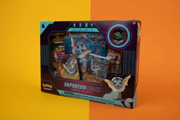 1 etched card featuring Vaporeon VMAX1 full-art card featuring Vaporeon V1 etched oversize card featuring Vaporeon VMAX, suitable for display1 colorful Vaporeon pin5 Pokémon TCG booster packs, each containing 10 cards and 1 basic EnergyA code card for the Pokémon Trading Card Game Online