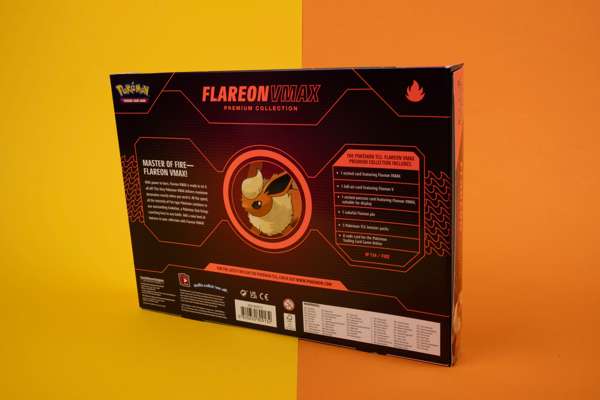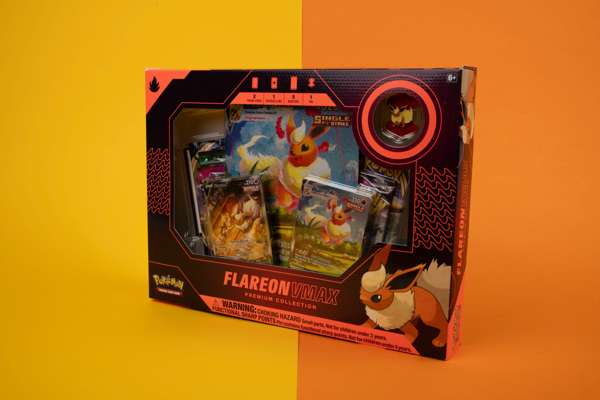 The Pokémon TCG: Flareon VMAX Premium Collection includes: