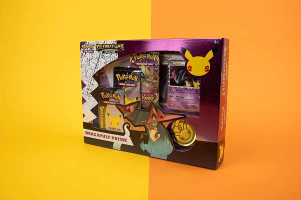 1 foil promo card featuring Dragapult Prime1 foil oversize card featuring Dragapult Prime2 Pokémon TCG: Celebrations 4-card booster packs1 additional Pokémon TCG booster pack containing 10 cards and 1 basic EnergyA 4-pocket binder to hold your cards1 coin featuring the Pokémon 25 logo1 information sheetA code card for the Pokémon Trading Card Game Online
