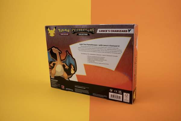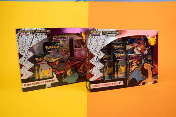 1 foil promo card featuring Lance's Charizard V1 oversize card featuring Lance's Charizard V4 Pokémon TCG: Celebrations 4-card booster packs2 additional Pokémon TCG booster packs, each containing 10 cards and 1 basic Energy1 information sheetA code card for the Pokémon Trading Card Game OnlineDragapult Prime: