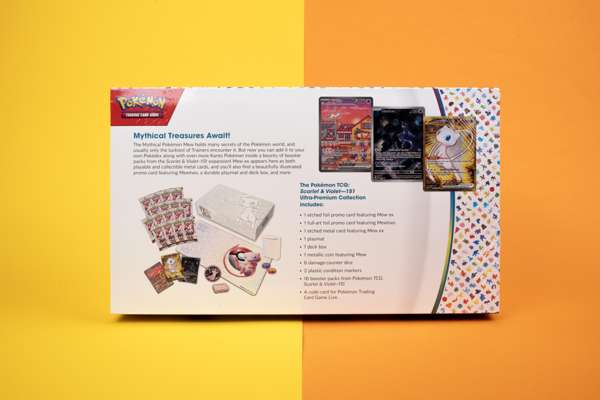 1 etched foil promo card featuring Mew ex1 full-art foil promo card featuring Mewtwo1 etched metal card featuring Mew ex1 playmat1 deck box1 metallic coin featuring Mew6 damage-counter dice2 plastic condition markers16 booster packs from Pokémon TCG: Scarlet & Violet—151A code card for Pokémon TCG LiveAbout this product: