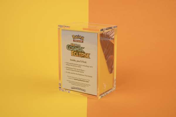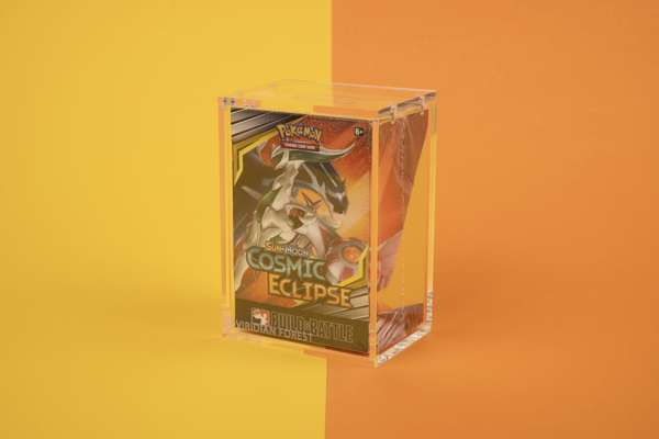 This lot contains a sealed Cosmic Eclipse expansion prerelease kit. It is stored in an acrylic protector from Viridian Forest.