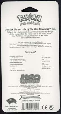 This lot contains a factory sealed Neo Discovery blister pack featuring the Smeargle artwork originally released in 2001. This is an unlimited booster pack. The box/pack is in fantastic condition and blister packs mean the booster pack inside is impossible to weigh.