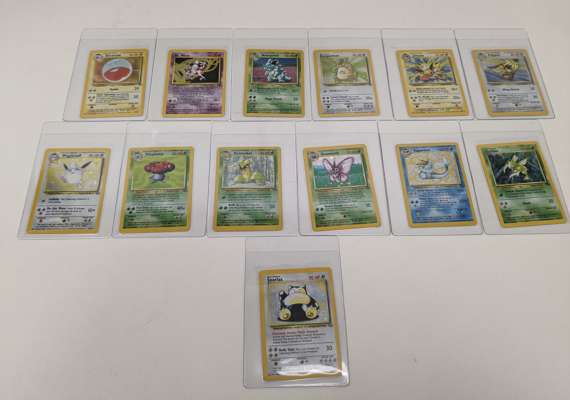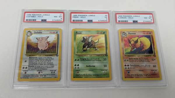 This lot features a complete Jungle expansion, the second ever Pokémon trading card set released in 1999. This collection comes from someone's childhood collection who slowly started to get the set graded with PSA, as such you receive every card from Jungle, all 16 holos and 3 graded cards. The average condition of this set varies, the grades awarded from PSA range from 5-8 on the graded cards that features the Holo Celfable (8) Flareon (8) and Pinsir (5). The overall condition of the raw cards range from light to moderate play. Every Holo comes sleeved in a semi rigid ready for grading!