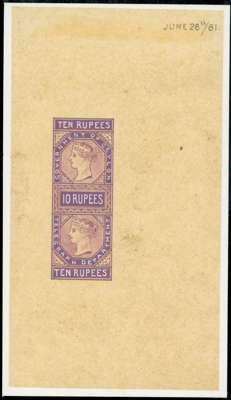 Telegraphs: 1881 Stamp Sized HAND PAINTED Essay for the 10r in the revised design with values at top and base, executed in rose-lilac on tracing paper (72 x 138mm). Values and inscriptions in Chinese white, dated June 28th/81 at top right. A couple of minor marks clear of design, A unique and wonderful essay, ex De La Rue archives and Taprobana, for SG T19