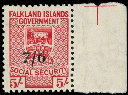Social Security: 1962 7s6d on 5s rose, wmk script CA, right marginal single showing centre guide, unmounted o.g. One of just two examples recorded of this surcarge. Heijtz ‘f’ cat £300 (see p.257) which is conservative in our opinion.