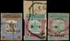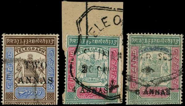 1905-09 Local Surcharges, group of three used halves comprising ‘TWO/ ANNAS’ on 2r brown & light blue, ‘4 ANNAS’ on 5r blue-green and carmine, notably in Type 15, (Narrow Seriffed letters) which has not been previously recorded (and raises the possibility of a composite setting of the 4a surcharge as well…), also 8a on 5r type 14 S.G. T40, T44, the third to be listed in part 1 2025 as S.G. T35a.