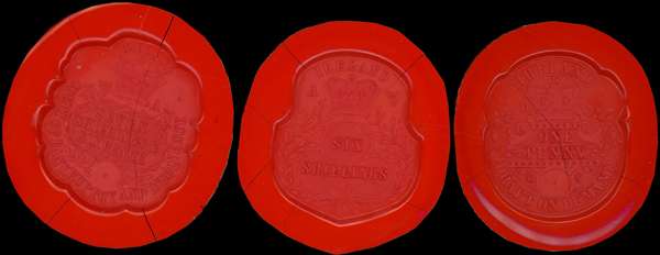 Embossed Revenue: 1857-60 Group of three wax moulds of embossed dies with blank date plugs in red wax, each dated on reverse, comprising ‘Draft on Demand’ 1d, (May 12 1858), General Duty six shillings, (22 Feb 1860) and 'Court of Bankruptcy and Insolvency' 7s6d (Oct 27 1857). A very rare group which would paint some colour into any exhibit!