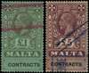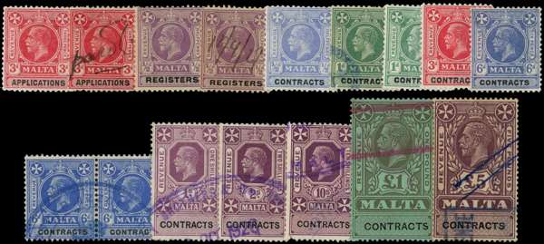 Contracts: 1925-26 ½d set to £5 comprising 9 of the 12 listed values (missing only 5s, 7s6d and £1 purple and black), fine to very fine used, a ew low values used uncancelled, also Applications 3d red and black and Registers ½d violet & black, a mint & used of each, Low values with odd minor imperfections and 10s with corner tear at lower left, though the key £1 and £5 very fine. McClellan B1, C1/6, C10/11, C13, Q1.