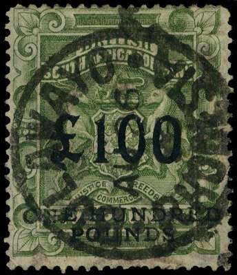 1896 Provisional surcharge £100 on £5 green, superb used with complete ‘BULAWAYO’ cds dated “AU 26” 1896. One of the great rarities of Rhodesian revenue philately with few examples known, this is the finest used example we are aware of despite a few perf blemishes and minor soiling at foot. Not to be missed!