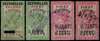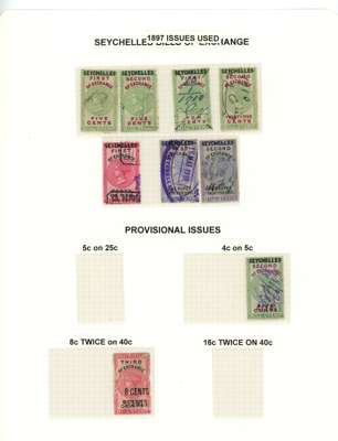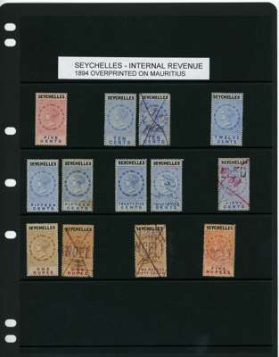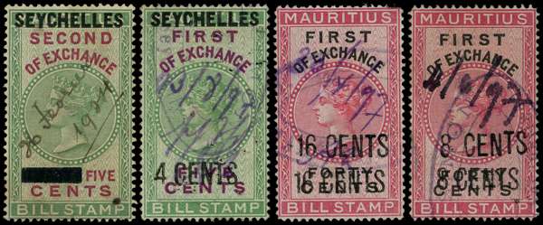 1896 overprints on Mauritius Collection on stock sheets comprising Bill of Exchange 5c 1st and 2nd, 40c 1st, and 1r25c 1st and 2nd, local PROVISIONALS 1897 ‘4 CENTS’ on 5c green 1st and 2nd, and 1897 surcharges with value twice on 40c red; 8 CENTS (1st & 2nd) AND ‘16 cents’ 1st used. Also ‘REVENUE’ oveprints on postage stamps 10 values to 15c, and Insurance 5c to 5r group of 13. A few blemishes and defects as almost always on these issues, still a desirable lot, the local provisionals extremely rare. Key Locals are McClellan B11, B21, B22 and B32.