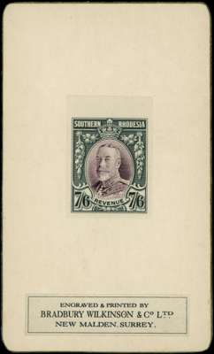 1930 7s6d black and purple, imperforate colour trial of the completed design in the issued colours affixed by upper margin to Bradbury Wilkinson presentation card (63x104mm), A clean and attractive proof