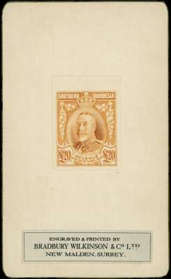 Southern Rhodesia Revenue 1930 £20 yellow and brown, imperforate colour trial