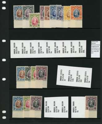 1930 Group of 17 fresh unused file copies, each lower marginal (aside from first printing 10s), comprising first printing 3s to £50 set of nine, 1932 printing 3s, 7s6d, 10s and £1, 1934 printing 3s, 10s and £1 and 1935 £1. each labelled with requisition number. A stunning and highly important record with comprises an example of every stamp from every printing, in unused condition.