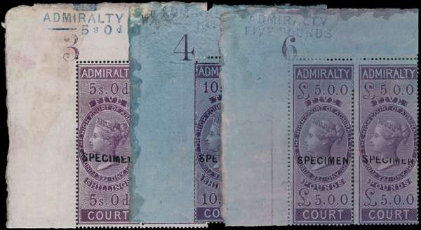 Admiralty Court: 1858 5s, 10s and £5 deep lilac, (the latter two on deeply blued paper) each handstamped ‘SPECIMEN’ type 6, fresh large part o.g. each an upper right marginal pair showing plate number 3, 4 and 6 respectively and crowned ‘ADMIRALTY’ handstamp in blue. £5 with central perf separation, otherwise very fine. In all likelihood a unique trio. Booth 9,11,12