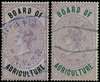 Board of Agriculture: 1889 £1 lilac and black, and £5 lilac and green, both fine USED, the £1 cancelled by blue oval hs in blue dated ‘28 OCT 1892’, the £5 cancelled with two pen strokes. £1 with two pin holes, still a highly desirable and excessively rare duo. Booth 36, 37.