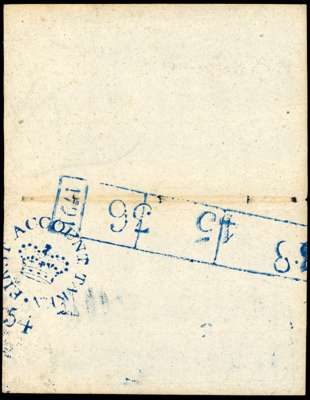 Painted Paper Duty. 1791 piece of blue-painted wallpaper. Two duty handstamps in blue on the reverse, Booth Type 108-4 ‘FIRST ACCOUNT TAKEN/ Crown/ 54’ and the Type 108-5 ‘frame mark’ dated 1791