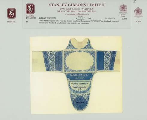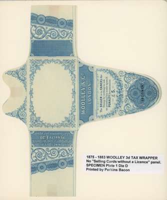 Playing Card Duty. 1875 3d Wrapper overprinted Specimen type 10. Appropriated to Woolley & Co. London. Plate 1 Die D with the Perkins Bacon imprint. Very scarce and in fine condition for these large wrappers. Booth Type 118G