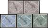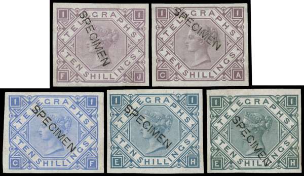 1877 10s Colour Trials on gummed paper, watermark Maltese Cross, in grey-green, slate-blue, dull mauve, brown-lilac and pale ultramarine. Each diagonally overprinted SPECIMEN Type 8 and with large part o.g., fine. For SG T16