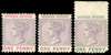 1884 colour trials (3) on gummed wmk CA paper, PERF 12, denominated ‘ONE PENNY’, each in lilac with frames in red (as issued), brown and green, the last of which is imperf between stamp and margin and likely unique thus. A super trio and highly unusual, with almost all other surviving DLR proof material for this issue perf 14.