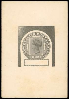 Postal Order Poundage Revenue: c.1890 ‘POUNDAGE’ die proof on thick card with blank value tablets and uncleared surround. A very rare early stage proof of this final issued design, offered with an image of the completed postal order.