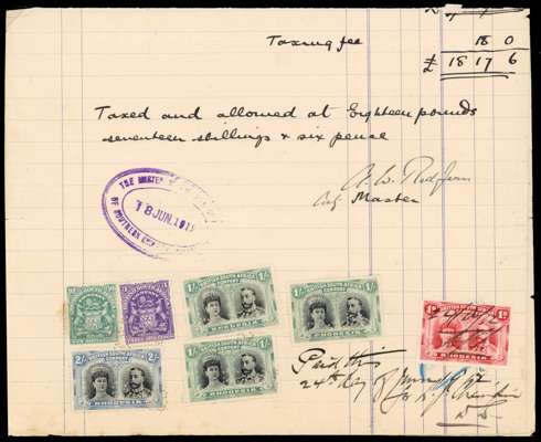 1912 Estate document from the Deputy Sheriff's Office, Bulawayo (folded). Bears 3s and 10s Arms (SG 86, 89), with Double Head 1d perf 15 (SG 170a), 3 x 1/- black and dull blue-green, mid gash plate (RSC C) and 2s black and china blue, thick ear plate (RSC C). 1d cancelled in manuscript, the others perfined with date 22 9 12. 10s Arms stained at left, the document a little fragile, otherwise fine