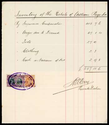 1911 Estate Inventory document with 5s Arms (SG 87) and 3s green and violet Double Head (SG 158) each perfined 27 2 11 and cancelled by violet oval THE MAGISTRATE OF THE HIGH COURT/ OF SOUTHERN RHODESIA, SALISBURY cachet