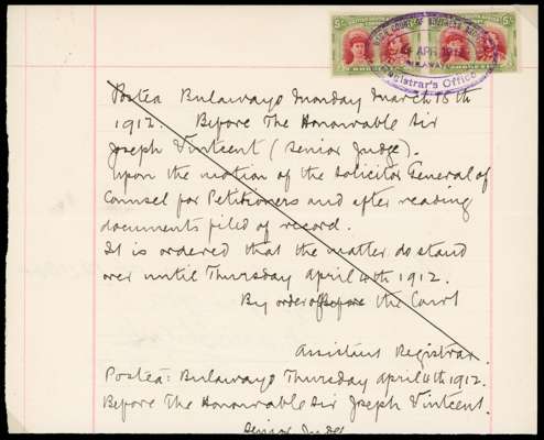1912 Court Order. Single page legal document (folded), the Court Order for the sequestration of the Chimborazo Syndicate. Bears horizontal pair of 5s crimson and yellow-green (SG 160a), each perfined ‘4 4 12’ and cancelled by “HIGH COURT OF SOUTHERN RHODESIA/ 4 APR 1912/ BULAWAYO/ Registrar's Office”