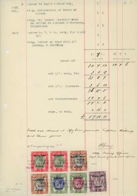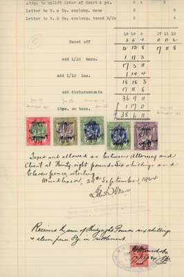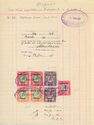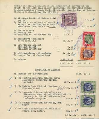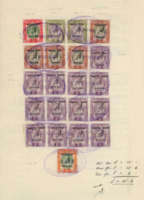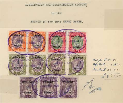 Revenues. Second overprint: ZUIDWEST 14½mm, SOUTH WEST 18½mm. A small group of document pages of this difficult issue (8), one with bi-lingual pairs of the £2, £1, 10s and 1s, a company registration bearing a 5s bi-lingual pair and an estate document with a 2s bi-lingual pair, the other documents bearing £1 and 3s bilingual pairs with various mixed frankings. A fine lot