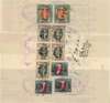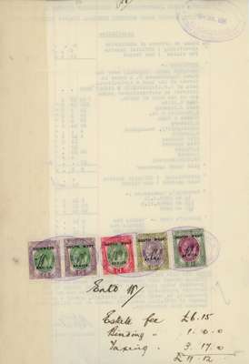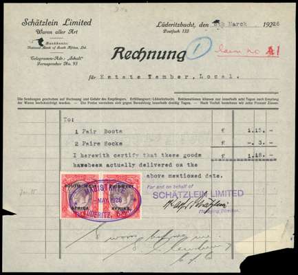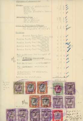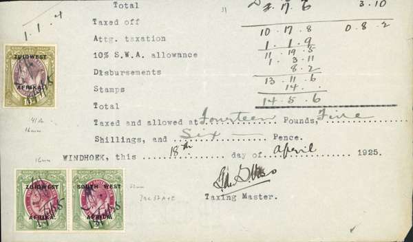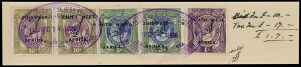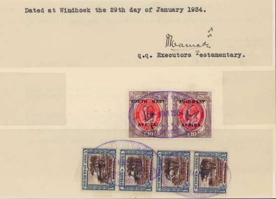 South West Africa Revenues. Third overprint; ZUIDWEST 16½mm, SOUTH WEST 22½mm. A collection of documents including one bearing a bilingual pair of £25 orange and green, 1931 small head £5 green and grey (block of 5) and 1933 postage 20/- (3) overprinted REVENUE or INKOMSTE with bars through postage, offered with five further documents and a piece with bilingual pairs of £10, 10/-, 5/-, 3/- with the overprint shifted to the left margin, 2/-, 1/- (2) and 6d. Also singles, one 3/- with overprint shifted well to left