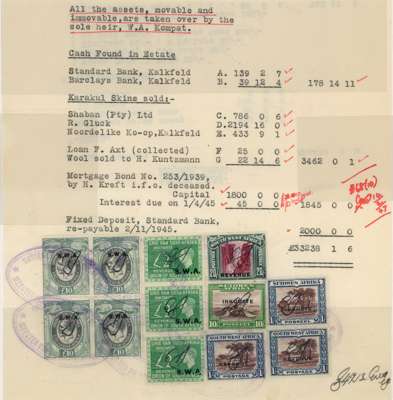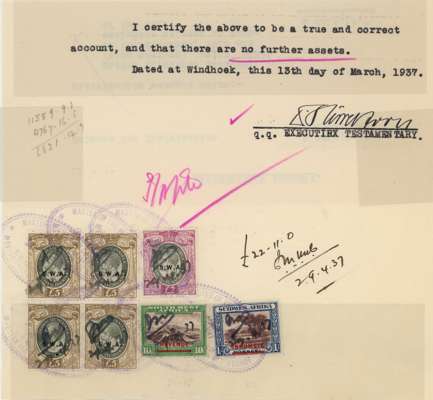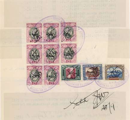 Revenues. c1931 small format KGV head, overprinted S.W.A. at top. Three documents, the first franked with £10 black and grey block of four, 1940 £2 green strip of three and 20/-, 10/- and 1/- (3) pictorial revenues, the second document page bearing £5 black and brown block of four with £2 black and purple with 10/- and £1 pictorial revenues, the third bearing £2 black and purple (8, including a block of 6) and 20/-, 1/- and 6d pictorial revenues. A splendid group, multiples of this issue very rare
