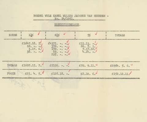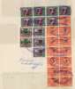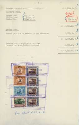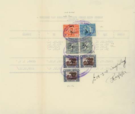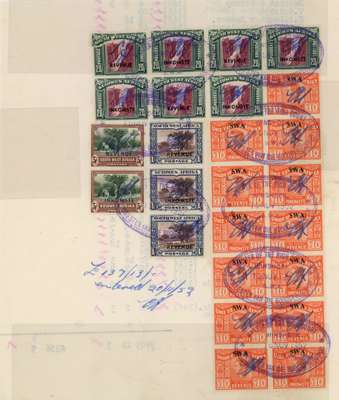 Revenues. Jacobson "Series 6" issue overprinted "SWA". Documents (5) with the narrow overprint (8 and 9mm); the first with a vertical bilingual pair of the £25 brown with 8mm wide SWA overprint, 1946 £5 blue with seriffed overprint and 1933 pictorial 5/- and 1/- (strip of four); the second with a vertical bilingual pair of the £25 brown with 9mm overprint,1946 £5 blue with seriffed overprint and 1933 pictorial 20/-,10/- and 1/-; the remaining documents (3) with £10 and £2 values with the narrow overprint, including £10 orange (block of 11). Fine