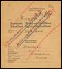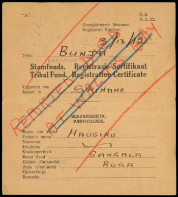Tribal Taxes; Okavango. A registration card showing payment for 1937 with 1933 5/- green and brown Penalty (Boete) stamp cancelled with initials, and the payment for 1938 with a 1931 5/- small KGV head stamp overprinted Okavango cancelled with initials. The holder reported DEAD and the orange marking crosses the stamps. A very scarce franking combination