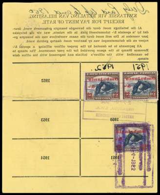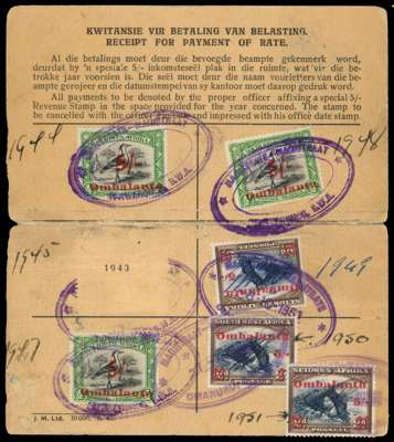South West Africa. Tribal Taxes. Ombalantu. A pair of Registration Cards, one marked "Duplicate" on face and "Duty Paid up to end 1950" on reverse with 1931 postage 2d blue and brown bilingual pair with surcharged "Ombalantu / 5/-" with diamonds over the original value and two types of the "bent top of the vertical stroke of 5/-" variety together with another heavily cancelled variety, the second card franked with three 1939 ½d black and green with large 5/- over the tribal name and three 1931 postage 2d blue and brown with diamonds over the value, two of the stamps with the "bent top of the vertical stroke of 5/-" variety. A total of seven cards from this small tribe are known