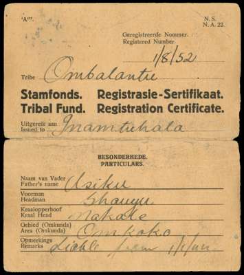 South West Africa. Tribal Taxes; Ombalantu. A pair of Registration Cards, one marked "Duplicate" on face and "…