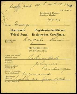South West Africa. Tribal Taxes; Ondonga. A registration card paying the tax for 1948-1951