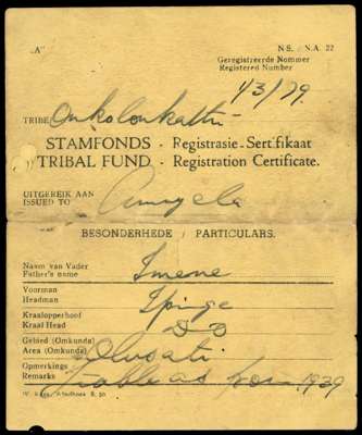 South West Africa. Tribal Taxes; Ovambo. Registration card with payments for 1951-1955