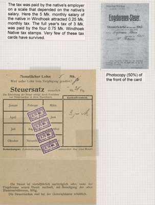 Windhoek Native Tax. Two 1913 Native Employment cards, one franked with 0.75m violet (4) and the other with 0.25m blue (6) stamps for Native employees of "Mr. Thompson". Scarce items with a very low survival rate