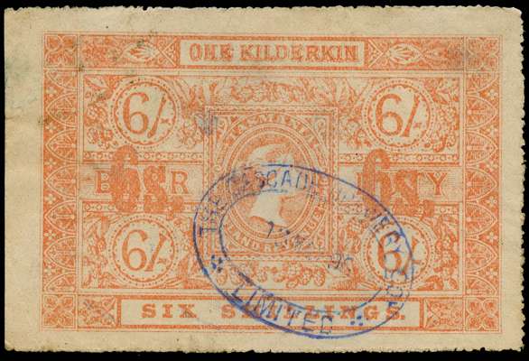 TASMANIA 1897 Revenue Beer Duty: 1897 'One Kilderkin' 6s on 6s orange Local printing