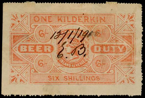 Beer Duty: c.1898 'One Kilderkin' 6s 'red', very fine used, cancelled in black with ms '12/1/1900' and initials. A very fine example of this delicate and very rare large format issue.