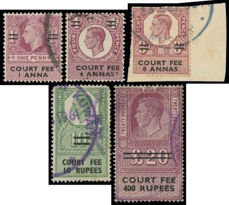 Court Fee Revenue: 1948-57 used group of five KGVI unappropriated dies overprinted for use in Trucial States comprising 1a on 1d, 4a on 4d, 8a on 8d lilac, 10r on 10s green and 400r on £20 purple and black, each used with part cds cancel, the 8a (on piece) 'Muscat' and the 10s 'Kuwait'. A very rare group indeed and some of the rarest revenue stamps of the KGVI reign, this 400r on £20 top value the only example we have seen or handled. McClellan C11, C13/14, C21, C27.