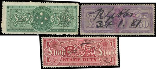 VICTORIA (AUS) 1884 SG 283ca, 285a, 287 Revenue £25 bright blue-green, £50 dull purple, £100 crimson