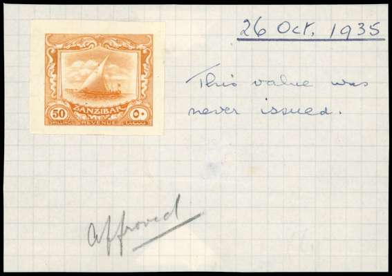 Revenue. 1935 (26 Oct) 50s ‘Dhow’, imperforate proof (3-4mm margins) in brown-orange on thin surfaced wove, Script wmk, affixed to piece (108 x 75mm) from the De La Rue archives and endorsed “This value was never issued” and marked “Approved” in pencil, superb and unique in this form.