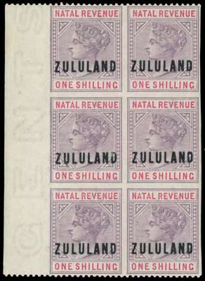 1888 Natal 1s lilac and red overprinted ‘ZULULAND’ left marginal IMPERFORATE block of six perforated horizontally at top and foot only, fresh and fine mint o.g, very lightly mounted at top only. A very rare and attractive block.
