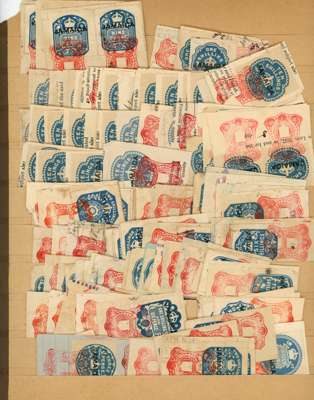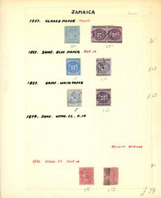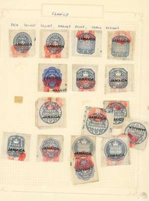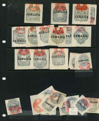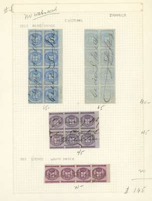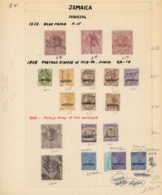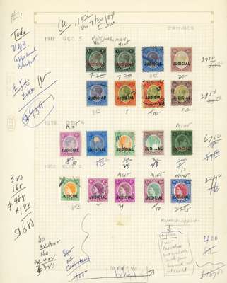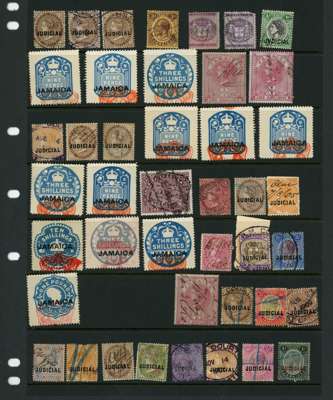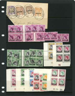 QV- QEII collection on pages, comprising good selection of CUSTOMS issues including early imperf and perf issues with scarce multiples and strips impressively complete JUDICIAL range including QEII set in plate blocks, KGV, KGVI and QEII sets used to 8s6d value, and a large adhesive embossed group on pages and stock sheets with used values to £10. A fun lot which would be an excellent basis for expansion.
