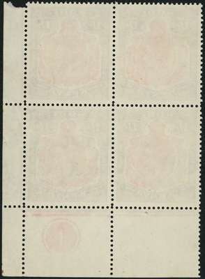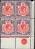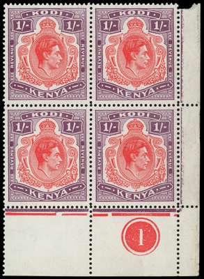 Kodi (Poll Tax): c.1950 1s vermilion and purple, line perf 13.25 x 13, lower right corner block of four showing plate number "1", fresh unmounted o.g. A choice multiple of this difficult stamp.